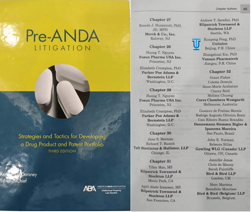Recently, the Pre ANDA Litigation: Strategies and Tactics for Developing a Drug Product and Patent Portfolio (Third Edition) organized by the American Bar Association (ABA) was officially published. Dr. PENG Kunpeng, a partner of Unitalen, as a specially invited author, participated in the writing of the content related to the Chinese drug registration and patent linkage system therein.
