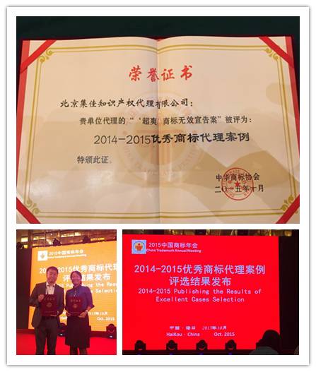 10月18日上午,由中華商標協會和海口市政府主辦的2015中國國際商標品牌節·商標優秀案例評析論壇在海南國際會議中心召開。集佳代理的“超爽”無效宣告案件入選中華商標協會評選的22件優秀商標案例,被評為“2014-2015優秀商標代理案例”。