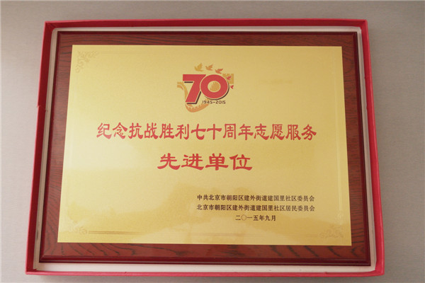 其中,我公司許燕妹、吳朝、李騰、王春菊4位志愿者在長安街執(zhí)勤引導(dǎo)觀禮群眾的志愿服務(wù)活動中,認(rèn)真負(fù)責(zé)、無私奉獻(xiàn)、成績顯著,體現(xiàn)出了志愿者嚴(yán)謹(jǐn)細(xì)致、奉獻(xiàn)求實(shí)、拼搏奮斗的優(yōu)良作風(fēng)。他們被中共北京市朝陽區(qū)建外街道建國里社區(qū)委員會和北京市朝陽區(qū)建外街道建國里社區(qū)居民委員會授予“紀(jì)念抗戰(zhàn)勝利七十周年志愿服務(wù)先進(jìn)個人”證書。與此同時,集佳也被授予“紀(jì)念抗戰(zhàn)勝利七十周年志愿服務(wù)先進(jìn)單位”稱號。