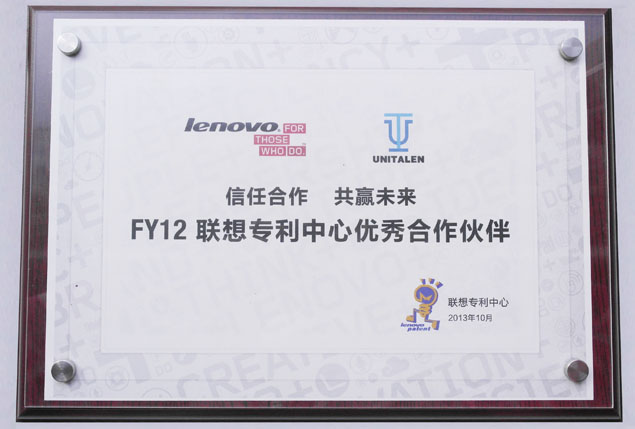 2013年底,聯(lián)想到訪集佳,并授予“信任合作 共贏未來(lái) FY12聯(lián)想專利中心優(yōu)秀合作伙伴”的牌匾。