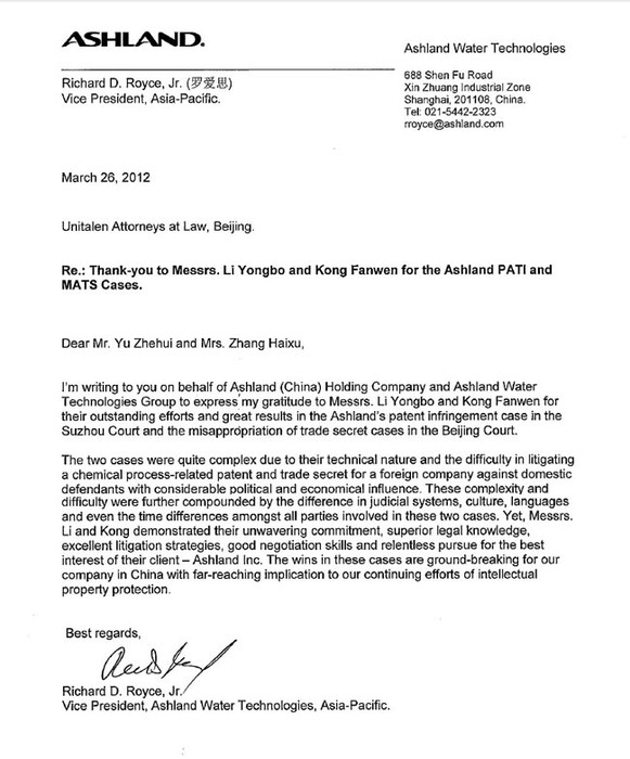 2012年年初,集佳律師事務所李永波律師和孔繁文律師代理的美國亞什蘭公司擁有的“水包水型聚合物分散體的制造方法及其產品” 專利及商業秘密維權案件獲得全面勝利。近日,集佳收到由亞什蘭亞太區副總裁Richard D.Royce,Jr簽署的感謝信,感謝集佳一直以來對于本案的不懈努力,并對代理本案的李永波律師和孔繁文律師的辛勤付出表示感謝,對集佳全心全意為客戶服務的工作態度表示肯定。