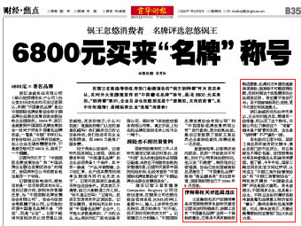 2007年4月5日,《京華時報》財經(jīng)焦點整版刊登了新聞:《鍋王忽悠消費者 名牌評選忽悠鍋王 6800元買來“名牌”稱號》,各大媒體紛紛轉(zhuǎn)載報道。集佳律師事務(wù)所李永波律師接受了《京華時報》記者的采訪。