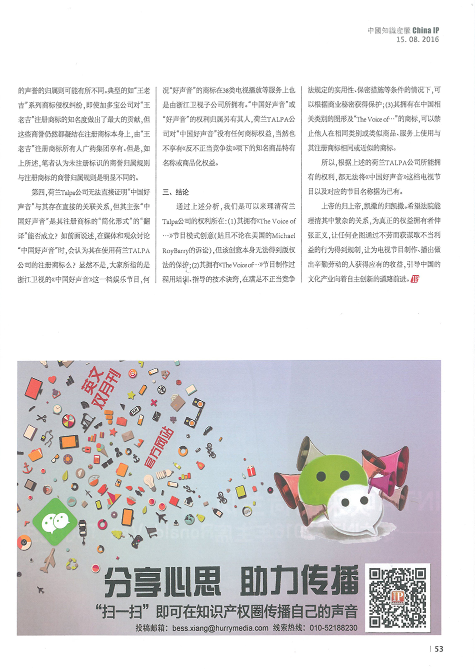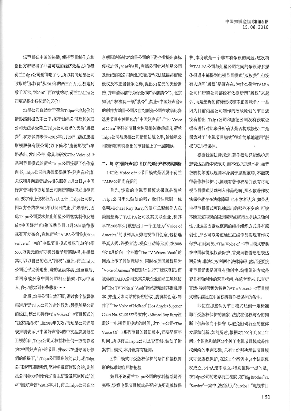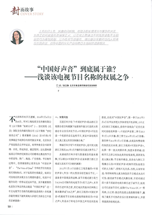 集佳資深律師侯玉靜文章《“中國(guó)好聲音”到底屬于誰?——淺談該電視節(jié)目名稱的權(quán)屬之爭(zhēng)》在《中國(guó)知識(shí)產(chǎn)權(quán)》發(fā)表