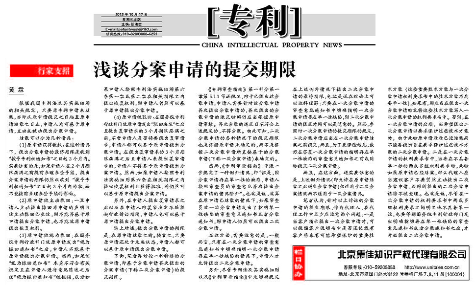 《中國知識產(chǎn)權(quán)報》:淺談分案申請的提交期限