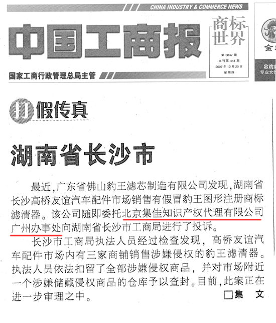 《中國工商報》:打假傳真:豹王湖南打假