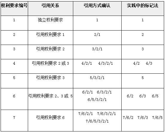 在上表中給出的權(quán)利要求引用關(guān)系中,在判斷時(shí)每個(gè)權(quán)利要求的每個(gè)方案都必須單獨(dú)被對(duì)待。對(duì)于其中存在的多項(xiàng)引用權(quán)利要求(上表中的權(quán)利要求4、6和7),當(dāng)其接到拒絕理由、限制要求或?qū)彶閱T的其他要求或意見時(shí),可僅針對(duì)單個(gè)權(quán)利要求提出。例如,對(duì)于權(quán)利要求4引用權(quán)利要求2的方案、權(quán)利要求4引用權(quán)利要求3的方案,當(dāng)遇到反對(duì)理由時(shí),可僅在反對(duì)理由中針對(duì)權(quán)利要求4提出。