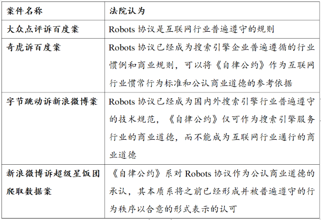 百度訴奇虎“360搜索引擎”案中,法院認為,百度在奇虎發出修改百度Robots協議的要求后應在合理期限內書面告知拒絕修改的合理理由,在百度未明確提出合理理由的情況下,奇虎在《自律公約》簽訂后實施的爬取行為不構成不正當競爭。