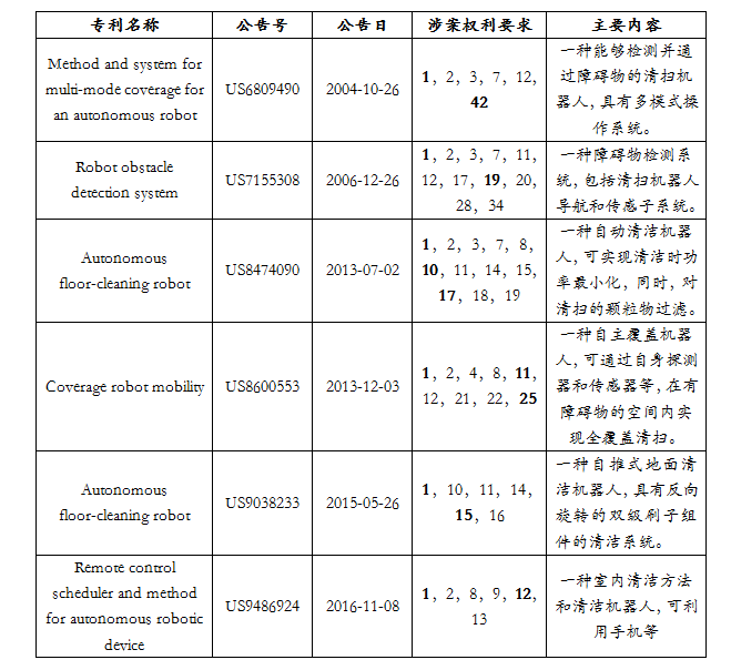 在本次調(diào)查中,iRobot使用了下述6件專利: