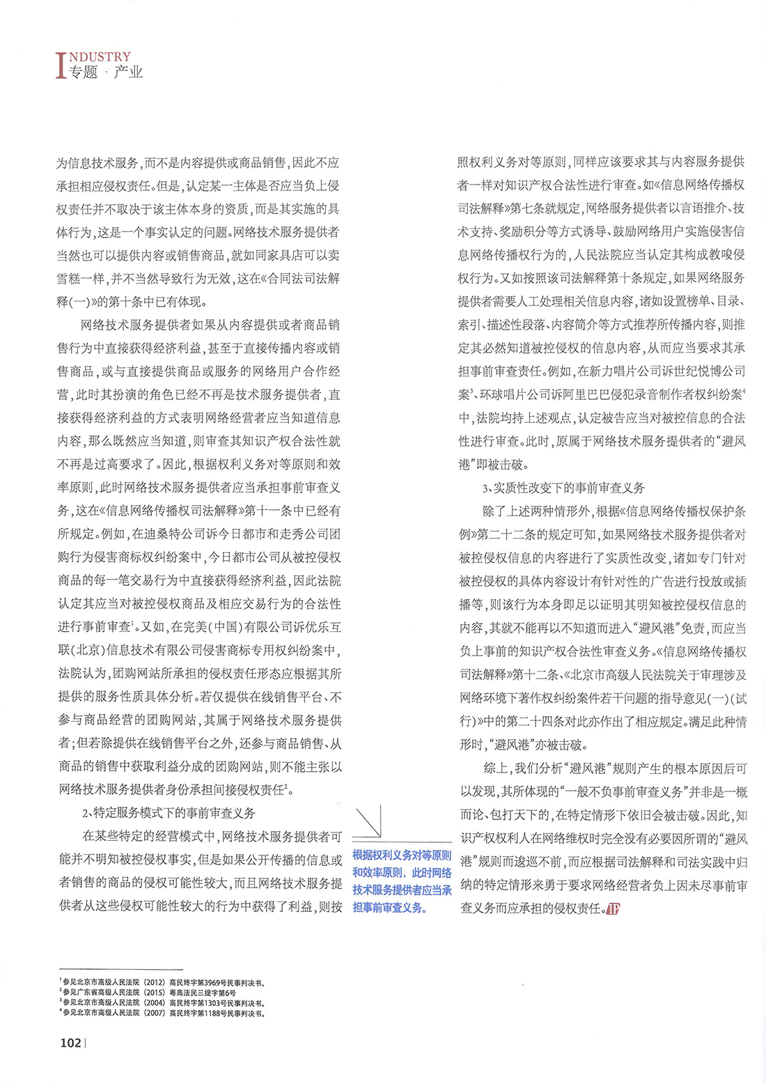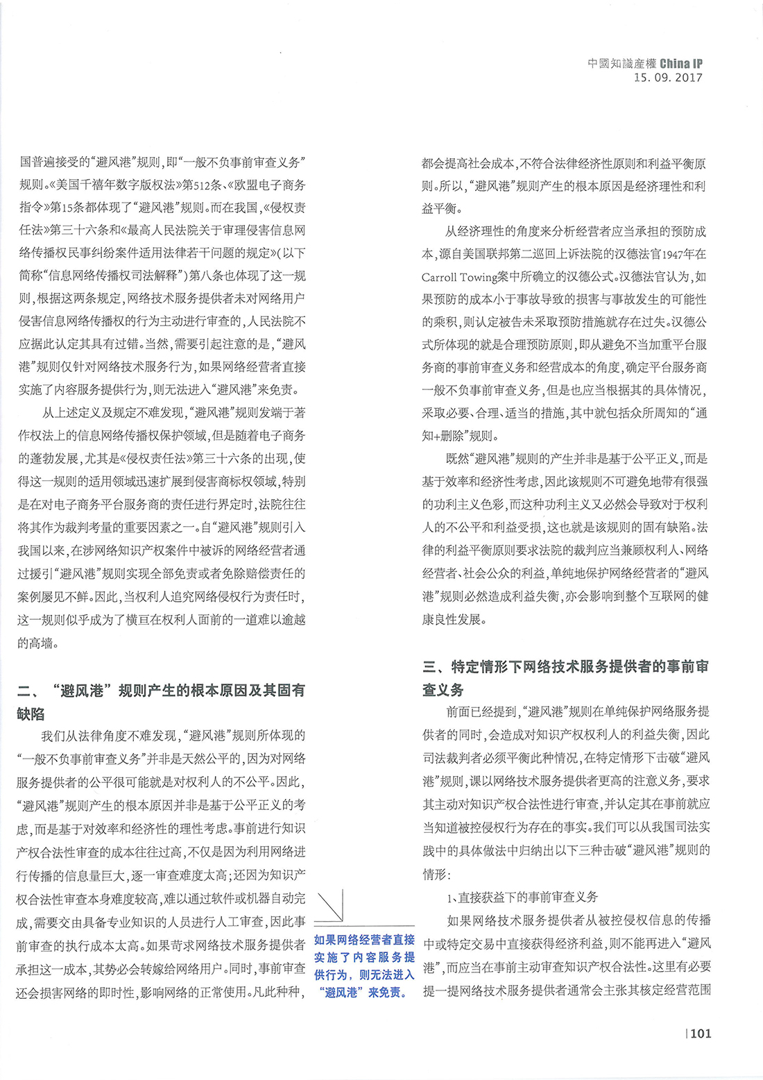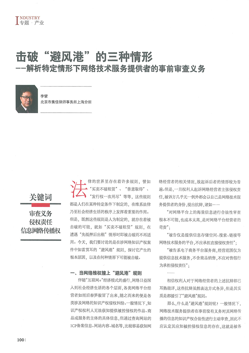 集佳文章《擊破“避風港”的三種情形——解析特定情形下網絡技術服務提供者的事前審查義務》在《中國知識產權》發表