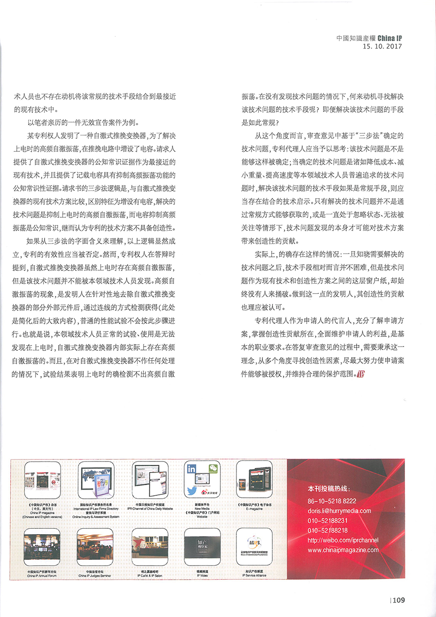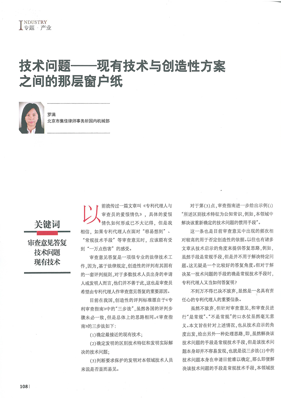 集佳文章《技術(shù)問題-現(xiàn)有技術(shù)與創(chuàng)造性方案之間的那層窗戶紙》在《中國知識產(chǎn)權(quán)》發(fā)表