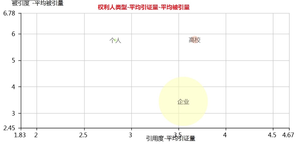 下圖為企業(yè)、高校、個(gè)人三種不同類型的權(quán)利人的專利質(zhì)量氣泡。橫坐標(biāo)為平均權(quán)利要求數(shù)量,縱坐標(biāo)為平均技術(shù)特征數(shù)量,氣泡大小為獲獎(jiǎng)專利數(shù)量。