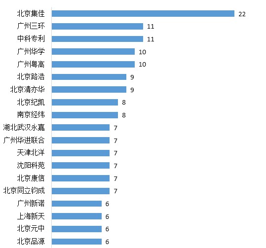對獲獎(jiǎng)專利的代理機(jī)構(gòu)進(jìn)行分析,發(fā)明、實(shí)用新型代理量方面,北京集佳知識產(chǎn)權(quán)代理有限公司以22件的專利代理量領(lǐng)跑專利代理行業(yè),是第二名廣州三環(huán)和中科專利的兩倍。南方大所廣州三環(huán)、廣州華進(jìn)聯(lián)合、廣州粵高排名居前。南京經(jīng)緯、北京康信、北京路浩、武漢永嘉、北京品源、北京同立鈞成等專利代理機(jī)構(gòu)緊隨其后。