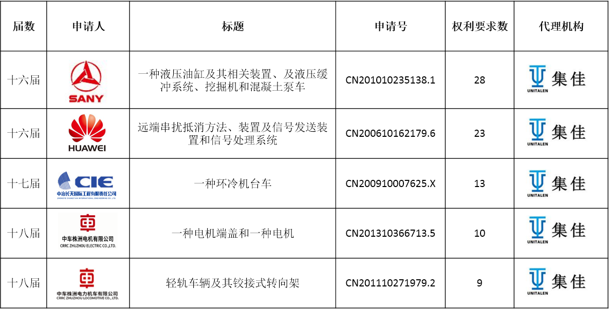 下表為集佳代理的獲獎專利清單。祝賀獲獎的專利權人和發明人。