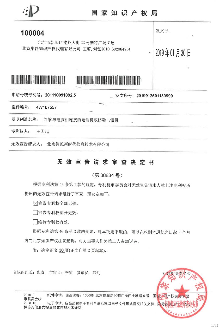 集佳成功無效王國起專利,還移動通信、互聯網及金融行業以寧靜