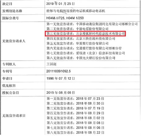 涉案專利名稱為“能夠與電腦相連接的電話機或移動電話機”,基于該專利,專利權人王國起自封“發漢字和圖像信息的電話機/移動電話機的全世界首創人”。2018年,王國起同時與中國移動、聯通、電信、搜狐、蘋果、華為、小米、錘子、農行、交行等等30余家企業發生專利侵權行政糾紛,涉案金額共計數十億元之多。