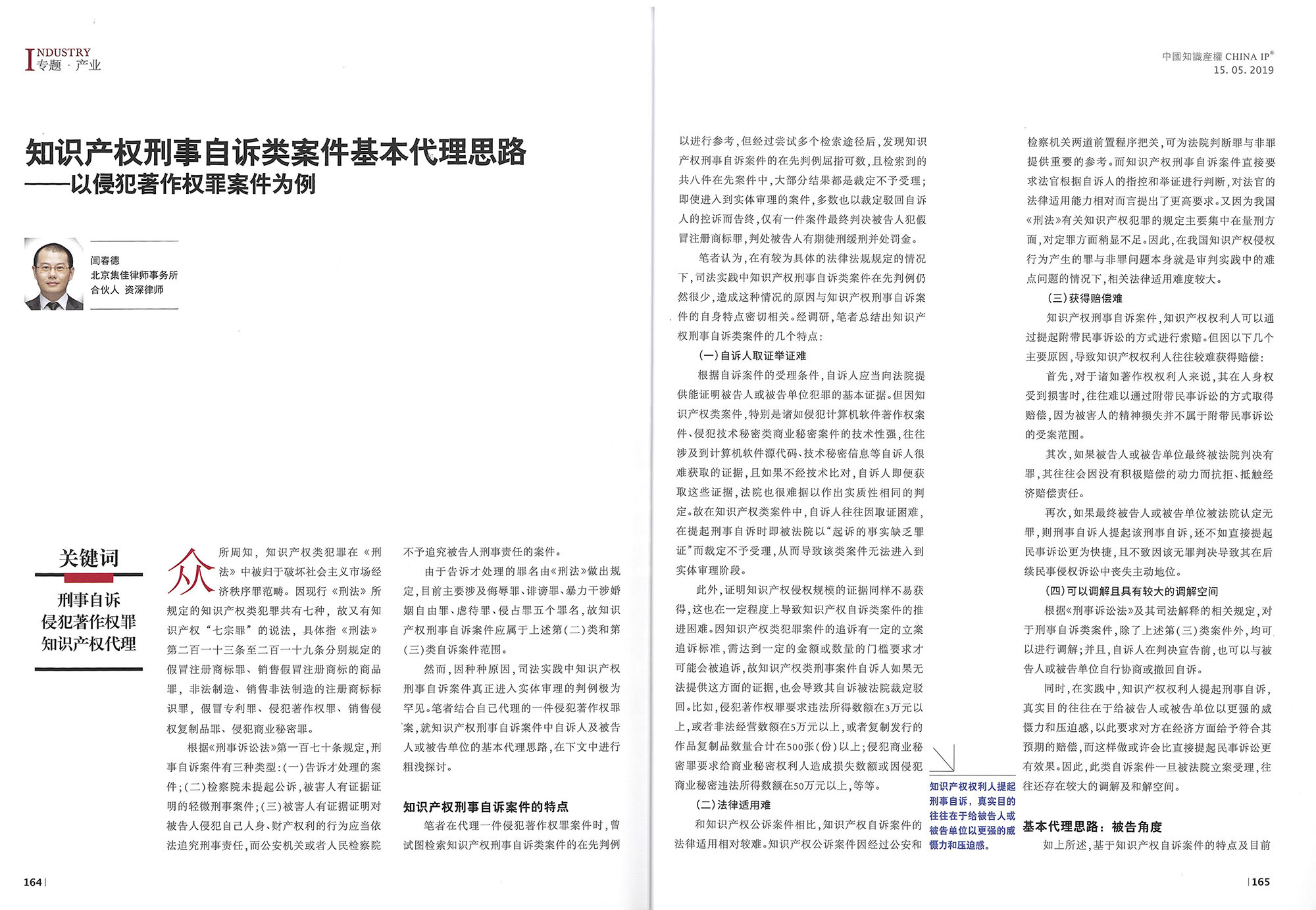 集佳文章《知識產(chǎn)權(quán)刑事自訴類案件基本代理思路—以侵犯著作權(quán)罪案件為例》在《中國知識產(chǎn)權(quán)》發(fā)表