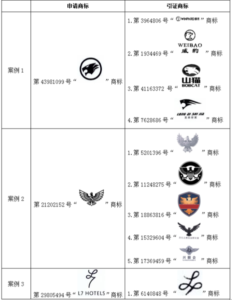”商標(biāo)),兩個(gè)申請商標(biāo)的指定商品類別、商標(biāo)包含的圖形都完全相同,申請日期接近,駁回復(fù)審中面對的引證商標(biāo)基本相同。筆者認(rèn)為,“