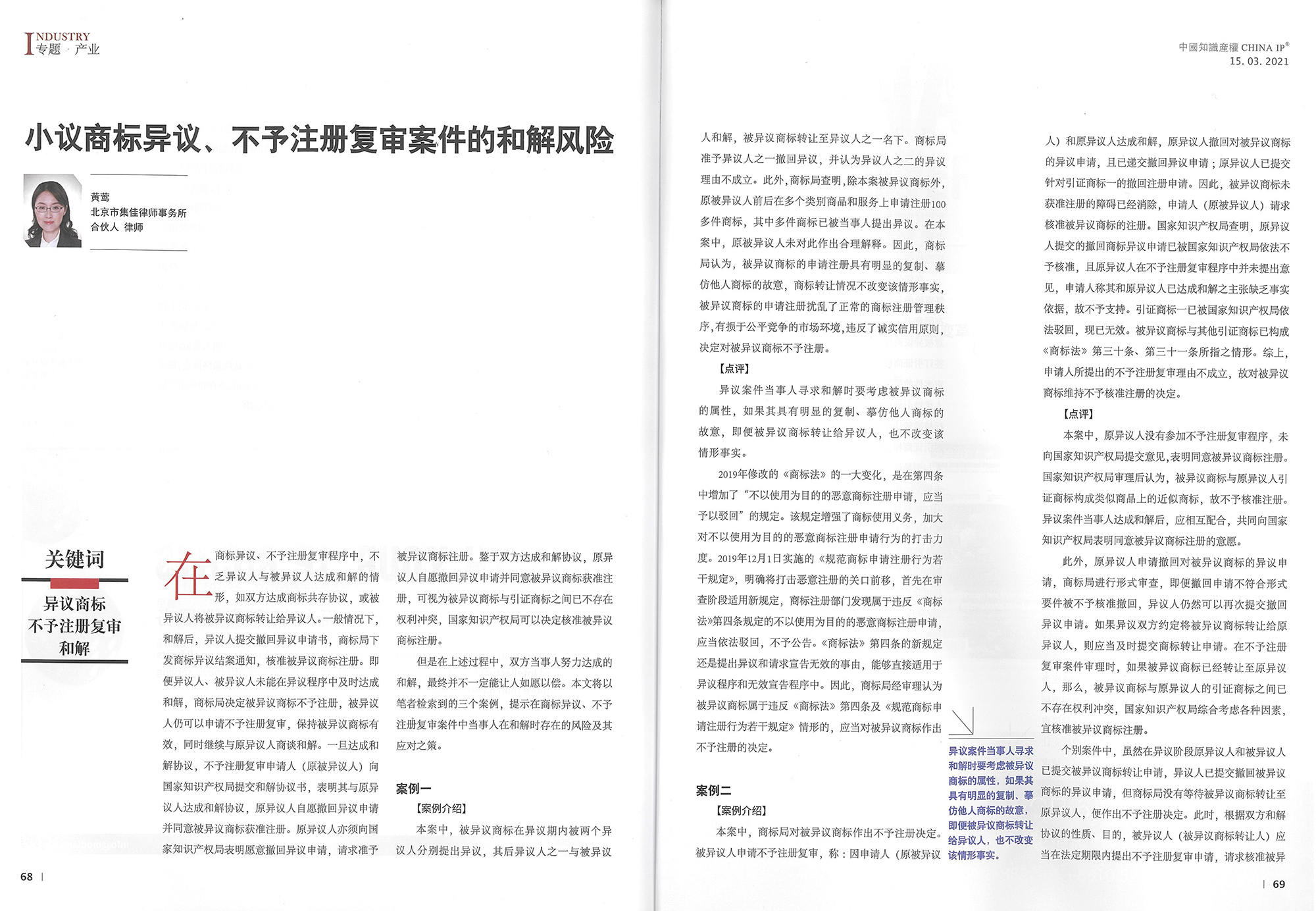 集佳文章《小議商標異議、不予注冊復審案件的和解風險》在《中國知識產權》發表