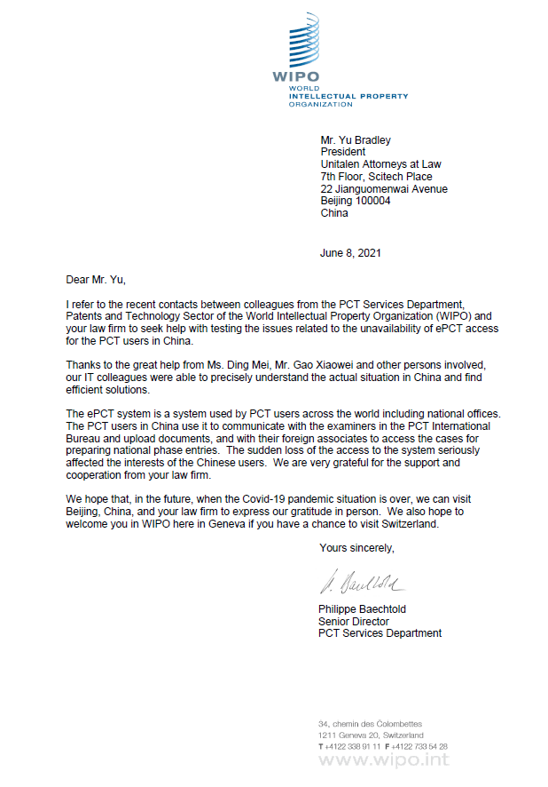 近日,世界知識(shí)產(chǎn)權(quán)組織(WIPO)國際局PCT服務(wù)部高級(jí)司長Philippe Baechtold向集佳合伙人會(huì)議主席于澤輝所長發(fā)來感謝信,對協(xié)助PCT服務(wù)部完美解決了WIPO ePCT系統(tǒng)在中國使用問題的集佳工作人員表示衷心感謝!