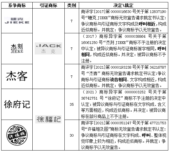 可以看出,上述案件中的系爭商標(biāo)是對針對“杰克”“徐福記”商標(biāo)進(jìn)行的惡意摹仿注冊。“杰克”商標(biāo)為杰克科技股份有限公司旗下的品牌,使用在第7類“縫紉機(jī)”等商品上,曾被認(rèn)定為馳名商標(biāo),并多次獲得馳名保護(hù)。“徐福記”為徐福記國際控股集團(tuán)有限公司旗下品牌,同樣曾被認(rèn)定為馳名商標(biāo),并多次獲得馳名保護(hù)。這兩件商標(biāo)均具有較高的知名度及影響力,也是被其他主體大量惡意摹仿注冊的對象,對于上述惡意摹仿的與“杰克”“徐福記”讀音相同的商標(biāo),在異議及無效宣告中均被認(rèn)定與引證商標(biāo)近似。