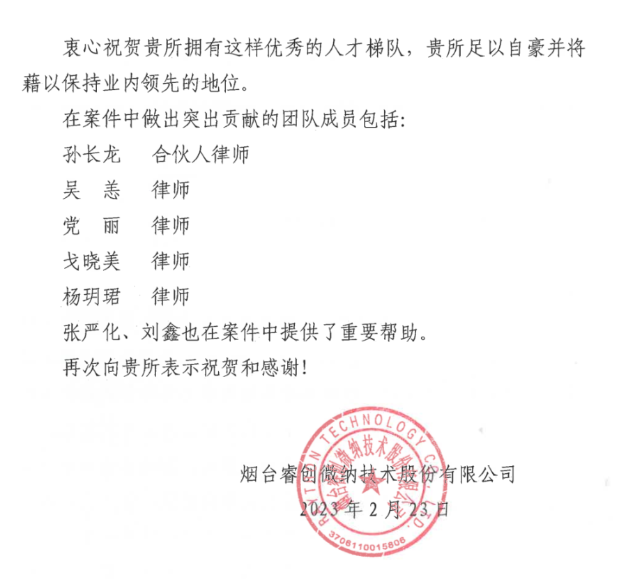 The commendatory letter sent by Raytron Group to Unitalen Law Office
