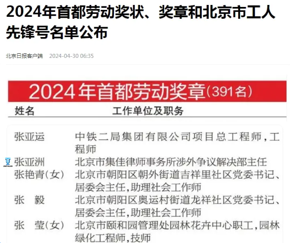 在五一勞動節來臨之際,北京日報公布了“2024年首都勞動獎狀、獎章和北京市工人先鋒號”名單,該評選由北京市總工會、北京市人力資源和社會保障局組織,旨在弘揚勞模精神、勞動精神和工匠精神。集佳合伙人張亞洲律師榮獲2024年首都勞動獎章,是首都司法行政系統獲此榮譽的4名先進個人之一!