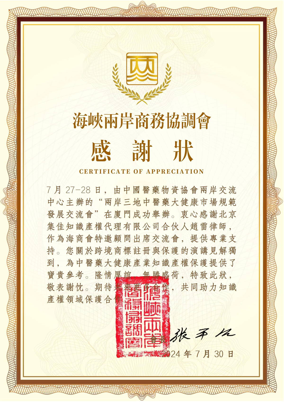 7月27-28日,由中國醫藥物資協會兩岸交流中心主辦、廈門市藥學會、深圳市健康產業協會、廈門市藥品行業協會協辦的“中醫藥大健康市場規范發展交流(閉門)會”在廈門成功舉辦。集佳合伙人趙雷律師作為海峽兩岸商務協調會顧問,應邀參加交流會并圍繞跨境商標注冊與保護發表演講,為中醫藥大健康產業相關知識產權保護的策略布局提供有益思考。