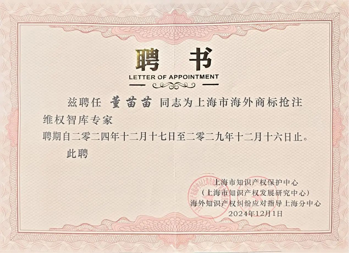 董苗苗律師從眾多候選人中脫穎而出,被聘任為上海市海外商標(biāo)搶注維權(quán)智庫專家